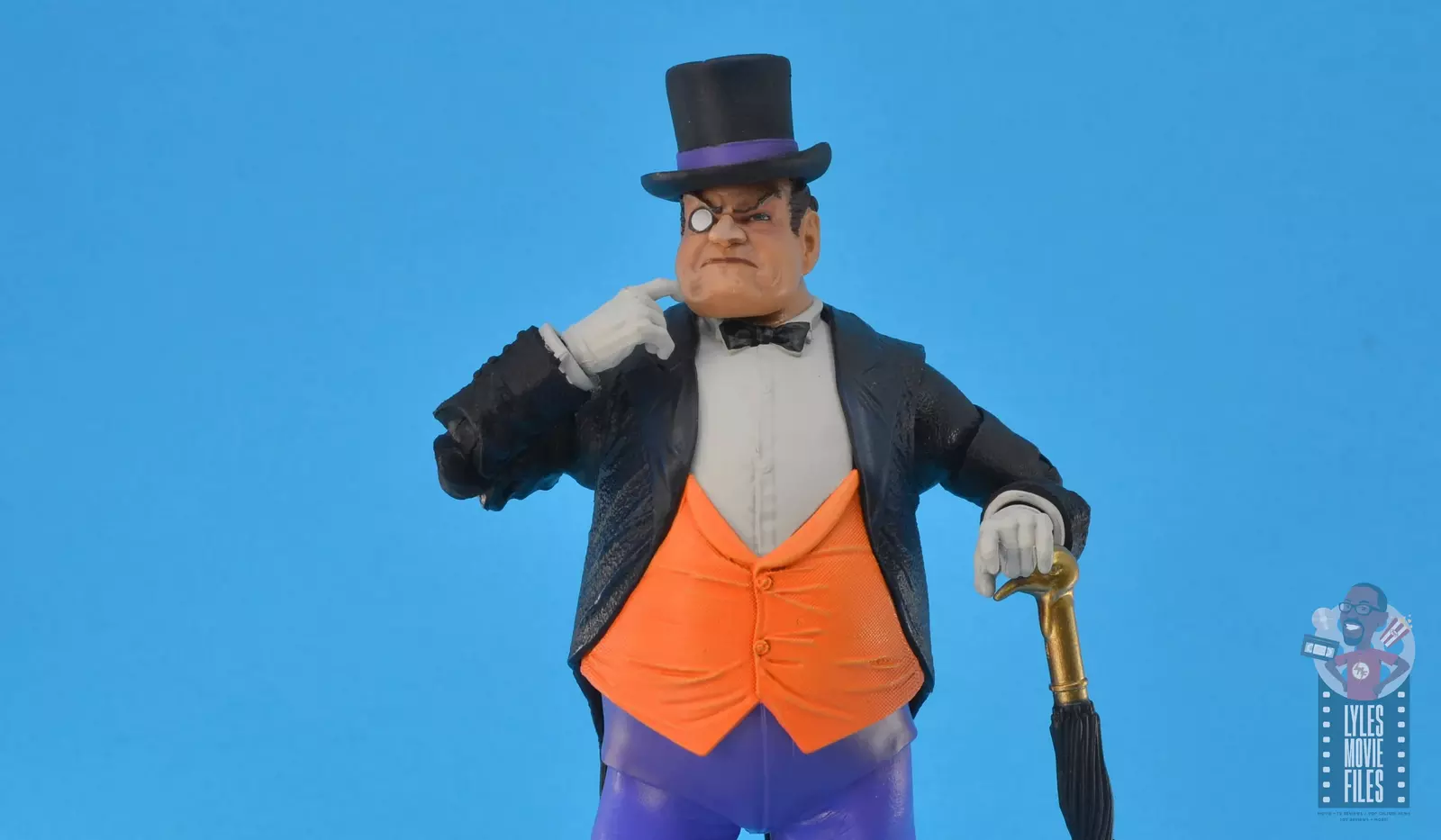 From the reference photos included with the figure, he should have more of a potbelly that’s spilling over his waist coat. That gives him an extra layer of sloppiness. The McFarlane sculptors didn’t want to make him look too goofy and gave Penguin a visible rounded belly with a better fitting waistcoat.
